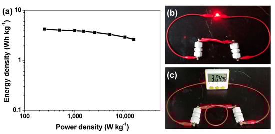 (a) Ragone plot of an as-assembled HPC-2//HPC-2 supercapacitor cell; (b,c) Digital photographs of a red light-emitting diode bulb and a portable timer well powered by two HPC-2//HPC-2 supercapacitor cells connected in series, respectively.