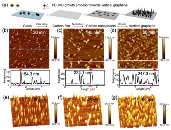 Plasma-enhanced chemical vapor deposition (PECVD) growth towards the formation of vertically-oriented graphene (VG). (a) Schematic illustration of VG growth by the radio-frequency PECVD (rf-PECVD) method. (b–d) Typical 2D atomic force microscopy (AFM) height images (5 µm × 5 µm) of directly-grown VG films on soda-lime glass at various growth time: (b) 30 min, (c) 45 min, (d) 60 min, respectively, with the identical growth conditions (10 standard cubic centimeter per minute (sccm) CH4, 600 °C, 300 W). Insets show the section view of the images along the white-dashed line direction. The corresponding 3D AFM height images are shown in (e–g).