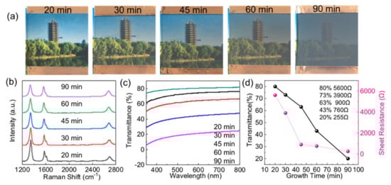 Moreover, D’ band appears around 1610 cm−1, corresponding to the highest frequency feature in the density of states [33]. The intensity ratios of ID/ID’ were ~5.49, 4.33 and 6.58 at the first growth stage for 20, 30, 45 min, respectively, which indicates the occurrence of obvious vacancy defects [34]. After 45 min of growth, the intensity ratios of ID/ID’ were estimated to be ~2.89 and 2.73, suggesting the evolution of abundant grain boundary defects [34,35]. The details are shown in Table S1. Specifically, the transparencies of the VG films on glass (at 550 nm) are tunable from 80%, 73%, 63%, and 43% to 20%, by varying the growth time of VG from 20, 30, 45, and 60 to 90 min, respectively (Figure 2c). The sheet resistance also varies significantly with the values of ~5.60, 3.90, 0.90, 0.76 and 0.26 kΩ/□, accordingly, as shown in Figure 2d. Briefly, this series of results show the wide tunability of the optical and electrical properties of the synthesized VG films on soda-lime glass.