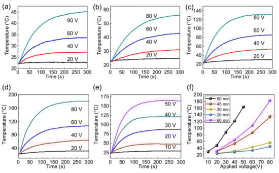Electrothermal performances of VG films on glass (5 cm × 5 cm) under varied growth times from 20, 30, 45, and 60 min to 90 min, respectively. (a–e) Time versus temperature profiles under different applied voltages. (f) Steady-state temperature versus the applied voltage plots for the different samples.