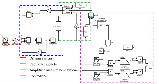 Key components of numerical simulations, including the driving system, cantilever model, amplitude measurement, and feedback loop of the PID controller.