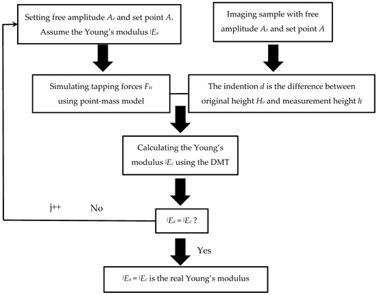 To obtain the physical properties of unfamiliar materials, we can assume the Young’s modulus as Ea and simulate the peak tapping force Fmax at different free amplitudes Ao and the set point amplitude A. Simultaneously, scanning experiments of the sample can be implemented with AFM under the same parameters as those used in the simulation, including the scanning parameters and the tip and sample properties. After scanning, the measured height h of the sample is obtained for different free amplitudes and set point amplitudes corresponding with the simulation. However, the measured height h is not the real sample height because the indentation d is induced under tip contact with the sample at the tapping force. Therefore, the original height Ho is the sum of the indentation d and the measurement height h, i.e., Ho = d + h. Using the peak tapping force Fmax, original height Ho, and other parameters in the DMT model, we can obtain the calculated Young’s modulus Ec. In comparing Ec with Ea, if the assumed Young’s modulus Ea is the real elastic modulus of the sample, it should be equal to the calculated Young’s modulus Ec. If Ea is not equal to Ec, we assume another Young’s modulus and repeat the same steps mentioned above until reaching Ec = Ea, which is the real Young’s modulus of the sample. The specific steps of the ACM are shown in Figure 2.