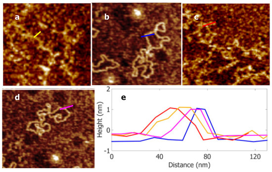 AFM images of DNA duplexes on mica surface. (a) Free amplitude was 38 nm, set point was 21 nm, and measured height was 1.1 nm. (b) Free amplitude was 16 nm, set point was 14 nm, and measured height was 1.5 nm. (c) Free amplitude was 30 nm, set point was 21 nm, and measured height was 1.3 nm. (d) Free amplitude was 22 nm, set point was 17 nm, and measured height was 1.4 nm. (e) Section curves taken along the lines in (a–d), as indicated by color.