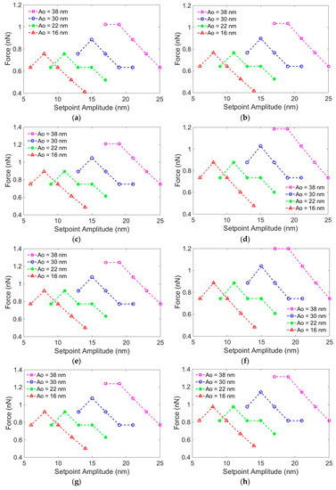 With the measurement height of DNA duplexes , the maximal sample indentation from the tip–sample interaction under the tip contact with the sample during scanning can be calculated using . Using the scanning amplitudes and the mechanical properties of the DNP AFM tip mentioned above, the tip–sample interaction force could be simulated using the point-mass model (Equation (1)) with the assumed Young’s modulus Ea of 50–250 MPa at 25-MPa increments. The maximal tapping force at the free amplitude and set-point amplitude of are shown in Figure 4, where the superscript j is the assumed Young’s modulus used in the simulation.