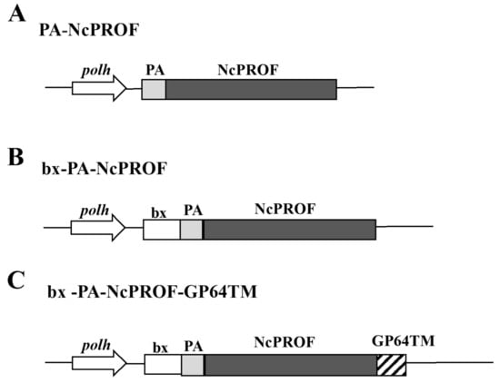 In this study, three NcPROF constructs were generated. PA-NcPROF has a PA tag sequence at its N-terminus (Figure 1A), whereas bx-PA-NcPROF has the signal sequence of bombyxin from B. mori at its N-terminus (Figure 1B). Meanwhile, bx-PA-NcPROF-GP64TM has the transmembrane and cytoplasmic domains of GP64 from BmNPV at the C-terminus of bx-PA-NcPROF (Figure 1C).