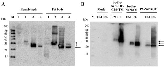 (A) Sodium dodecyl sulfate-polyacrylamide gel electrophoresis (SDS-PAGE) and western blot under reducing conditions. (B) SDS-PAGE of purified bx-PA-NcPROF-GP64TM from hemolymph using anti-PA tag affinity chromatography. M indicates the molecular weight marker; arrows indicate the recombinant bx-PA-NcPROF-GP64TM band.
