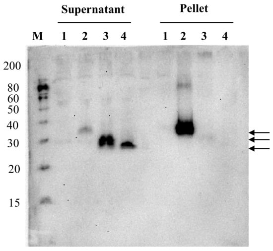 Western blots of soluble and insoluble fractions from the Bm5 cell culture supernatant. The culture supernatant containing bx-PA-NcPROF-GP64TM, bx-PA-NcPROF or PA-NcPROF was centrifuged at 100,000× g, and the pellet was resuspended in 1 mL of PBS. Lanes M, 1, 2, 3 and 4 denote the molecular marker, mock, bx-PA-NcPROF-GP64TM, bx-PA-NcPROF and PA-NcPROF, respectively. Upper, middle and lower arrows indicate bx-NcPROF-GP64TM, bx-NcPROF and NcPROF, respectively.