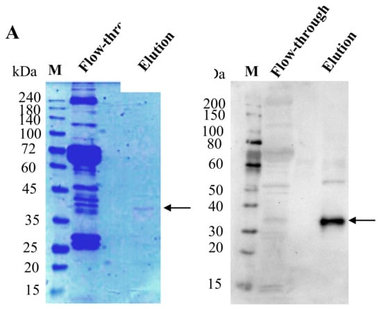 bx-PA-NcPROF-GP64TM was then purified from silkworm hemolymph using anti-PA tag agarose. As shown in Figure 4A, bx-PA-NcPROF-GP64TM was successfully purified as a single band in SDS-PAGE and was further verified by western blotting (Figure 4B). This finding indicates that bx-PA-NcPROF-GP64TM does not display on the surface of BmNPV particles because no band was observed in the purified sample except for bx-PA-NcPROF-GP64TM. These results suggested that bx-PA-NcPROF-GP64TM forms only some nanoparticles and can be secreted into hemolymph and the culture broth. The yield of purified NcPROF-GP64TM was approximately 14 µg from 3 mL of larval hemolymph.