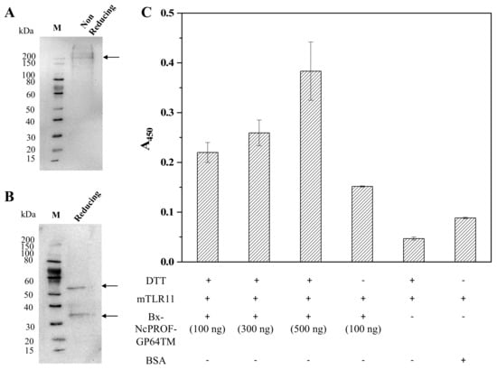 Western blots under reducing conditions (A) and nonreducing conditions (B) of purified bx-PA-NcPROF-GP64TM. (C) enzyme-linked immunosorbent assay (ELISA) analysis of the binding of purified of bx-NcPROF-GP64TM to recombinant mTLR11 Fc chimera. Purified bx-NcPROF-GP64TM (100 ng, 300 ng, 500 ng) with the 1 mM dithiothreitol (DTT) treatment and 100 ng of bx-NcPROF-GP64T without the 1 mM DTT treatment were assayed. Bovine serum albumin (BSA) was used as a negative control. The absorbance was detected at 450 nm and presented as means ±0.001~0.05 standard deviation with coefficient of variance ±0.7%~15%.