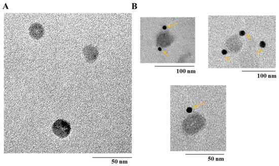 The morphology of purified bx-PA-NcPROF-GP64TM was observed using TEM. Nanoparticles with a diameter of 30 nm were observed in purified bx-PA-NcPROF-GP64TM (Figure 6A). To further analyze the purified bx-PA-NcPROF-GP64TM, immuno-TEM was conducted. The recombinant proteins were probed with rat anti-PA tag (NZ-1) and goat anti-rat IgG (H+L) conjugated with 12-nm gold beads. As shown in Figure 6B, bx-PA-NcPROF-GP64TM demonstrated a spherical morphology with a diameter of approximately 30 nm. These results indicate that bx-PA-NcPROF-GP64TM was secreted as nanoparticles (Figure 3).
