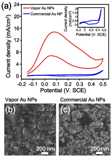After the CV measurements, SEM images of catalytic electrodes were obtained (Figure 6b,c). The vapor-phase-grown Au NPs were well dispersed on an FTO substrate, but the commercial Au NPs were slightly aggregated. The agglomeration would contribute to the low electrocatalytic activity of the commercial Au NPs [67,68]. To the best of our knowledge, the oxidation current density of 14.65 mA/cm2 obtained in this experiment is the highest value among those measured in the same media using Au-based electrodes, including self-supported nanoporous Au film electrodes [11], polycrystalline Au electrodes [13], and nanoporous Au electrodes prepared by dealloying Au-Ag [10]. The excellent catalytic activity of the Au NPs can be attributed to the combination of their clean surfaces [21,728, facets well-arranged by the Au (111) plane [69,70], and intimate contact with the FTO substrate. Consequently, we expect that this Au NS-based electrode can be a versatile tool for various catalytic and electrochemical applications.