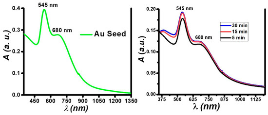 UV-Vis spectra of large, anisotropic AuNPs (left) and time-based formation of Au-Ag nanotwins (right) using the large, anisotropic AuNPs as seeds. The left AuNP seeds are generated by irradiation of 1 mM Au(I) precursor for 120 min using Source 1. The right panel Au-Ag nanotwins are formed by irradiating a 1:1 solution containing the AuNP seed and 10 mM AgNO3using Source 1.