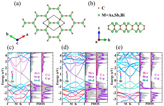Top (a) and side (b) view for monolayer M2C3. The band structures and corresponding projected density of states (PDOS) for (c) As2C3, (d) Sb2C3, and (e) Bi2C3.