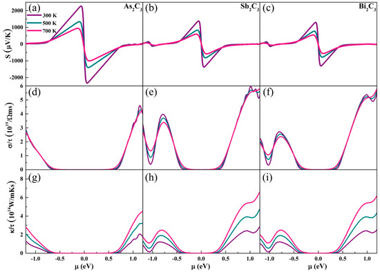 The electrical conductivity with respect to scattering time σ/τ is presented in Figure 2d–f. Unlike the Seebeck coefficient, the maximum σ/τ for As2C3 is lower than that of Sb2C3 and Bi2C3. Meanwhile, it is found that no matter what kind of materials, the σ/τ of n-type is always higher than that of the p-type, which is mainly attributed to the PDOS. We can see clearly that the slope of σ/τ will be flattened in low μ region (−0.5–0.5 eV) with the temperature increasing. The κe with respect to the relaxation time is shown in Figure 2g–i via the Wiedemann–Franz law [48]