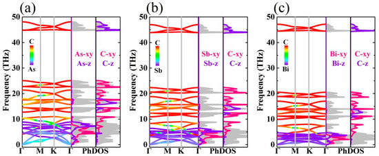 The phonon scattering curves of monolayer M2C3 is shown in Figure 3. No imaginary phonon frequencies appear in the phonon spectra, which indicates that the monolayer M2C3 is thermodynamically stable at ambient pressure. The acoustic branches of M2C3 exhibit a common phenomenon in 2D systems with a parabolic dispersion of out-of-plane acoustic mode and two linear dispersions of in-plane modes at the Γ point [49]. As shown in Figure 3, one can see that the M atoms dominate the low frequency region (below~10 THz), while the remaining area is from the C atomic contributions. Meanwhile, we also find that the acoustic modes for As2C3, Sb2C3, and Bi2C3 exhibit a downward moving trend, which can be attributed to the larger of atomic mass. It is noted that the low frequency optical modes are alternating and softening with the three acoustic branches for the monolayer M2C3, resulting in strong acoustic–optical interactions. This is similar to the PbSe [50], which has strong anharmonic effects. The boundary frequency of lowest optical branch displays a decreasing trend with the following order: As2C3 (4.18 THz) > Sb2C3 (3.08 THz) > Bi2C3 (2.12 THz). To further analyze phonon scattering properties, the corresponding phonon density of states (PhDOS) is presented. From the PhDOS, we can see clearly that the acoustic phonon branches mainly contain the M vibrations, while the contributions from C (xy) vibrations are mainly limited to 10 to 25 THz. The high frequency region from 45 to 50 THz is fully occupied by C (z) vibrations. In addition, the PhDOS also shows several peaks especially in optical branches region, which can give rise to the small phonon group velocity.