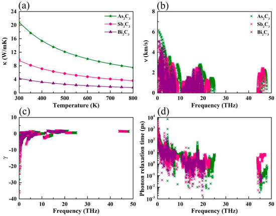where CV, να is the phonon specific heat and the phonon group velocity along α direction, and τqλ is the phonon relaxation time for the phonon mode λ at the wave vector q. The κl of monolayer M2C3, at temperatures from 300 K to 800 K, are plotted in Figure 4a. Obviously, the intrinsic κl shows evident temperature dependence, proportional to the inverse of the temperature 1/T. In the high temperature, this dependence behavior is deemed to a common phenomenon of crystals, which attribute to the intrinsic enhancement of phonon–phonon scattering. At room temperature, we can see clearly that the Bi2C3 exhibits an intrinsic low κl of 4.31 W/mK, which is lower than those of the Sb2C3 (9.53 W/mK) and As2C3 (20.82 W/mK). In general, the κl is mainly dominated by the acoustical modes for the monolayer systems [51]. Because the mass of Bi is larger than that of As and Sb, acoustical phonons have lower frequencies for Bi2C3 than for As2C3 and Sb2C3. These acoustic modes with low frequency might cause the small phonon group velocities, leading to the low κl.