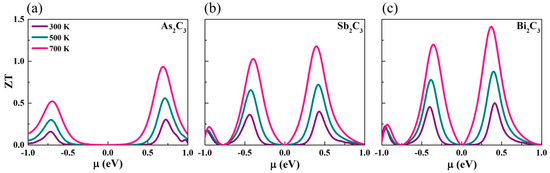 The thermoelectric figure of merit (ZT) versus the chemical potential of the (a) As2C3, (b) Sb2C3, and (c) Bi2C3 at different temperatures.