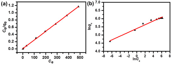 where the constants (KF and n) are related to the intercept and the slope of Figure 4b. The parameters for adsorption isotherms calculated from the above Equations (3)–(5) are shown in Table 1. The correlation coefficient (R2) values indicated that the dye adsorption process was well-matched to both models, but was better matched to the Langmuir isotherm model. It revealed that the dye adsorption started on both the homogeneous and heterogeneous active sites of NPC. The heterogeneous sites were from the possible functional groups contained on the NPC surface. There were negligible differences between the maximum adsorption capacity (qmax) fitted by the Langmuir model (417 mg/g), and the experimental value (415 mg/g), which also proved to be a better match to the Langmuir isotherm. According to Table 1, the RL value was near zero (0.0035), illustrating that the adsorption process was favorable and irreversible. Value n (8.656) in the range of 1–10, also illustrated that this adsorption was favorable [45,46].