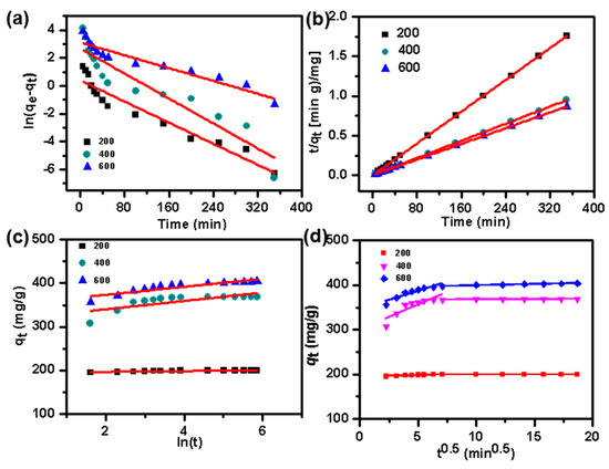 To study the effect of time, adsorption kinetics was measured by choosing different time intervals. Adsorption kinetics could also help to quantify the adsorption rate and illustrate the mechanism of adsorption. The adsorption kinetics of the MB-NPC was obtained by three different MB concentrations (200, 400, and 600 mg/L). The MB adsorption was rapid in the first 5 min (Figure 5), and then the adsorption rate gradually slowed down, with the proceeding time. At last, the adsorption achieved equilibrium, within 2 h. Four kinetics models were applied to figure out the kinetic mechanism of the dye adsorption. First, the adsorption kinetics was examined by the pseudo-first-order model. The equation is described as follows [47]: