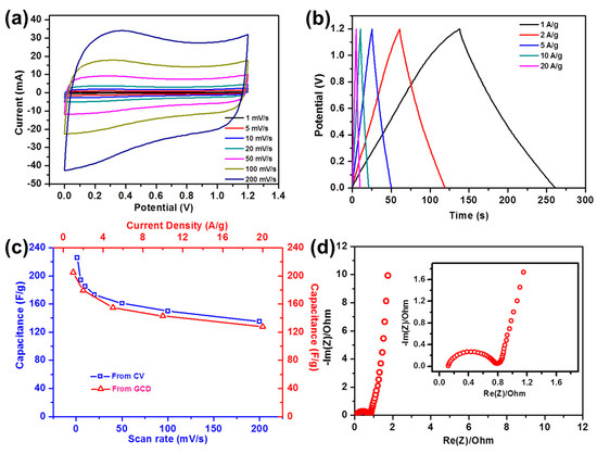 The electrochemical properties were studied in a full-cell setup, to evaluate the capacitive performance of NPC, in practice. Using 1 M Li2SO4 aqueous solution as the electrolyte, CV measurement could be tested in a wide voltage window from 0–1.2 V, at different scanning rates (Figure 9a). The similar shape for all curves suggested a negligible diffusion limitation in higher scanning rates. The CV curves showed a little distortion from rectangular, especially at a high scan rate, which might be due to the porosity saturation [57] and the poor mobility of highly solvated ion Li+ and highly solvated anion SO42− [58]. The specific capacitance derived from the CV, at a scanning rate of 1 mV/s, was calculated to be 226 F/g (Figure 9c). The large specific capacitance was benefits of the interconnected structure of the NPC. The interconnected structure could provide a good electron transfer, leading to a good electrical conductivity. In addition, this interconnected structure, formed from the aggregation of the ultra-small crystal, could supply the connected pores for a continuous and efficient ion diffusion. GCD was conducted to evaluate the stability in the potential window from 0 and 1.2 V, in a 1 M Li2SO4 aqueous solution (Figure 9b). NPC exhibits almost symmetrical triangular shapes within the wide potential window, implying a reversible capacitive performance, contributed by the electric double layer supercapacitor (EDLC), and excellent coulombic efficiency. To better analyze the rate performance of the electrode materials, the GCD curves of NPC, at various current densities from 1 to 20 A/g, were collected. The specific capacitances are 205, 179, 155, 143, and 128 F/g, at current densities of 1, 2, 5, 10, and 20 A/g, respectively (Figure 9c). The maximum energy density of NPC was 10.25 Wh/kg in aqueous electrolyte, among the highest values published. The Nyquist plot of the NPC revealed that the electrical conductivity was acquired from EIS measurements. In Figure 9d, from the intersection in the Z’ axis, the interface contact resistance was as low as 0.12 Ω. The low charge transfer resistance could be revealed from the small diameter of a semicircle, which benefited from the interconnected structure. The almost vertical curve in the low-frequency region indicated a fast ion diffusion and an ideal capacitive behavior. Good cycling stability was another important factor for capacitors. The electrochemical stability of the NPC was further evaluated at a current density of 10 A/g. Figure S4 shows that there was still a 97.8% retention of capacitance, for the NPC electrodes, after 5000 cycles, confirming a long lifetime.