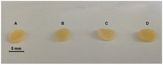 Photographs of (A) pure Lamina, (B) Lamina functionalized with 3-aminopropyl triethoxysilane (APTES) (see Experimental Section 2.2), (C) Lamina enriched with 5 µg/mL graphene oxide (GO) and (D) Lamina enriched with 10 µg/mL GO.
