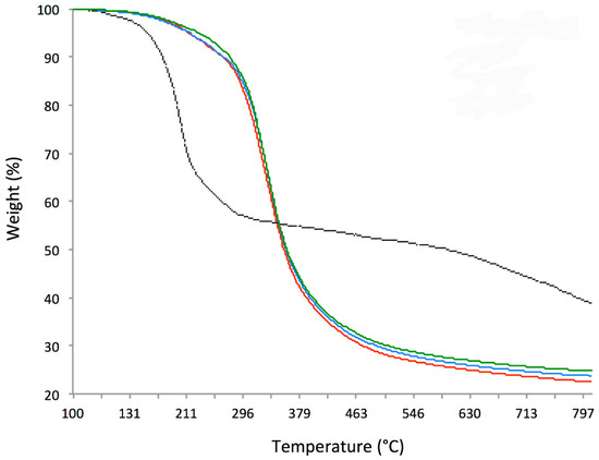 Thermo-gravimetric analyses (TGA) were recorded on a TGA Q500 (TA Instruments, New Castle, DE, USA) on ca. 12 mg sample. The runs were performed under nitrogen atmosphere by equilibrating the samples at 100 °C for 20 min, following a ramp at 10 °C/min up to 800 °C.