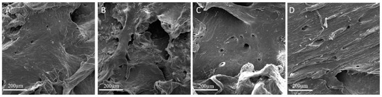 Scansion electron microscopy (SEM) images of (A) bare Lamina, (B) APTES-treated Lamina, (C) 5 µg/mL GO-coated Lamina and (D) 10 µg/mL GO-coated Lamina. Magnification 3000×. Scale bar: 200 µm.