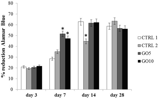 Alamar blue assay in DPSC cultured on bare Laminas (CTRL1), APTES-treated (CTRL2), 5 µg/mL GO-coated (GO5) and 10 µg/mL GO-coated (GO10) Laminas for 3, 7, 14, and 28 days. Forty Laminas were used for each experimental point, ten Laminas per experimental time. The histogram represents Alamar blue reduction percentage, data shown are the mean (±SD) of three separate experiments. Zero time % reduction Alamar Blue: 15.72%; * Day 7: GO5 and GO10 Laminas vs. control (CTRL1) Laminas p < 0.001; Day 14 control Laminas, GO5-coated and GO-10 coated Laminas vs. APTES-treated Laminas (CTRL2) p < 0.001.