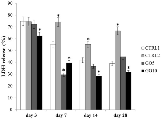 Lactate Dehydrogenase (LDH) assay of DPSC cultured on bare Laminas (CTRL1), APTES-treated (CTRL2), 5 µg/mL GO-coated (GO5) and 10 µg/mL GO-coated (GO10) Laminas for 3, 7, 14, and 28 days. Forty Laminas were used for each experimental point, ten Laminas per experimental time. Released LDH is reported as percentage. Data shown are the mean (±SD) of three separate experiments. Zero time LDH release (%): 73.06 * Day 3: 10 µg/mL GO-coated Laminas (GO10) vs. control (CTRL1) p < 0.05; * Day 7: APTES-treated, 5 µg/mL GO-coated (GO5) and 10 µg/mL GO-coated Laminas (GO10) vs. control (CTRL1) p < 0.001; control Laminas, APTES-treated Laminas vs. 5 µg/mL GO-coated Laminas (GO5) p < 0.001; control Laminas, APTES-treated Laminas vs. 10 µg/mL GO-coated Laminas (GO10) p < 0.001; * Day 14, day 28: APTES-treated, GO10 Laminas vs. control (CTRL1) Laminas p < 0.005.