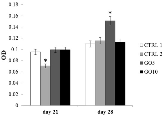 The histogram represents optical density (OD) values of solubilized calcium deposits (orange-red stained) obtained after Alizarin Red staining on bare Laminas (CTRL1), APTES-treated (CTRL2), 5 µg/mL GO-coated (GO5) and 10 µg/mL GO-coated (GO10) Laminas. Twenty Laminas were used for each experimental point, ten Laminas per experimental time. Data shown are the mean (±SD) of three separate experiments. * Day 21: APTES-treated Laminas vs. control (CTRL1) Laminas p < 0.005; * Day 28: control Laminas, APTES-treated, 10 µg/mL GO-coated Laminas (GO10) vs. 5 µg/mL GO Laminas (GO5) p < 0.005.