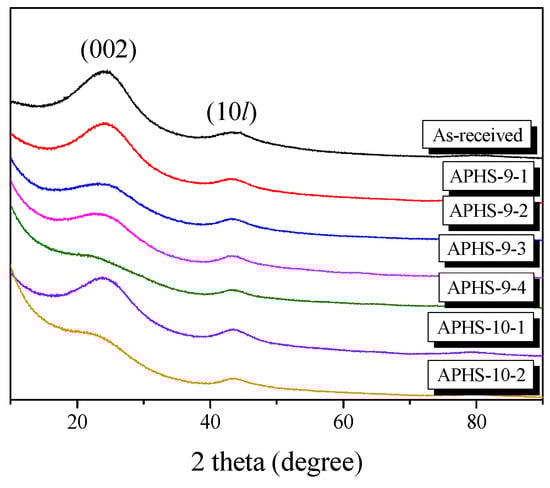 The interlayer spacing exhibited a large change at d002 and a small change at d10l. The interlayer spacing decreased up to APHS-9-1, and then increased. The increase in the interplanar distance d002 was clearly observed with increase in the activation time. More specifically, the distance decreased from 3.68 Å for the HC to 3.62 Å for APHS-9-1. The amorphous oxidation within HC is presumed to cause this decrease in the interplanar distance of d002. In addition, a similar trend is observed in APHS-10-1. After amorphous oxidation, the small crystallite is oxidized and increases the interplanar distance of d002. According to the activation progression, the specific surface area of APHS was increased by oxidation of small crystallites. Based on these observations, it can be postulated that long activation time and high temperature burn off the less ordered components and small crystallites, resulting in the increased specific surface area of the APHS.