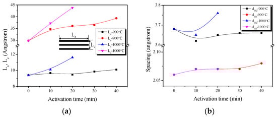 As shown in Figure 2, Lc does not exhibit a large change at an activation temperature of 900 °C, but does gradually increase with the activation time. However, La increases steadily with increasing activation time. In particular, the largest increase is found for the sample that was activated for 10 min, followed by 30 to 40 min. It is believed that much oxidation of amorphous parts or small crystallites occurred in this section. This was confirmed in the yield of Table 1. Both Lc and La increase significantly at the activation temperature of 1000 °C. These results suggest that the activation reaction at high temperature is strong and rapid.