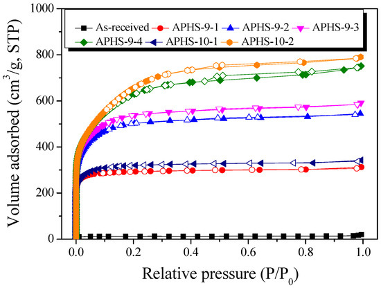 The adsorption isotherms of N2 at 77 K contain a large amount of information related to pore-structure. Because changes in the isotherms imply an alteration of pore structures; their measurements are the basis upon which to estimate the pore structure parameters. The specific surface area and pore structures of the APHS before and after activation were determined using N2 adsorption/desorption isotherms (Figure 3). There are six kinds of adsorption isotherm patterns according to the International Union of Pure and Applied Chemistry (IUPAC) classification [32], and each is indicated by a distinct pore structure. According to the IUPAC standards, the curves in Figure 3 all have Type I shape, largely consisting of micropores; longer activation time was associated with increased specific surface area and quantity of mesopores.