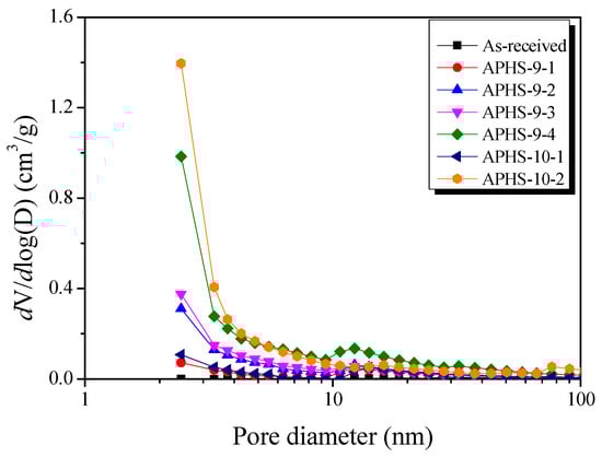 Figure 4 exhibits the mesopore size distributions after application of the BJH method. All samples have their highest intensity peak around 2.5 nm pore diameter. APHS-9-1 and APHS-10-1, and APHS-9-4 and APHS-10-2, were produced using different activation processes, but have similar specific surface areas. However, the APHS produced at higher temperatures exhibits greater mesopore volume. That is, the high activation temperature produced APHS that was richer in mesopores.