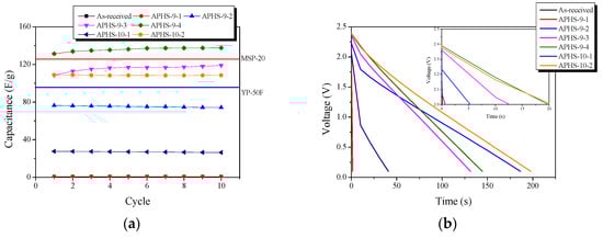 Figure 6a exhibits a change in the specific capacitance according to the charge/discharge cycle. All APHS exhibit stable initial specific capacitance. The specific capacitance is estimated from the galvanostatic charge/discharge curve (Figure 6b), which corresponds to the calculated specific capacitance of the electrode. The specific capacitance of all the APHS samples increases with increasing activation times and temperature. APHS-9-1 has very low capacity due to small pore size and low pore volume. The mobility of the ions within the pores is greatly influenced by pore size. If the pores are too small to allow easy access to electrolyte ions, they will not contribute to double-layer capacitance. APHS-9-2 has specific capacitance higher than that of APHS-9-1 because micropores and mesopores were significantly increased by activation. APHS-9-3 exhibits micropore and mesopore volume slightly increased over those of APHS-9-2; however, the specific capacitance increases significantly from 73.2 to 115.8 F/g. As discussed in Figure 5, the main pore diameter is distinctively enlarged due to expansion of the previously generated micropores and to collapse of micropore walls. Therefore, it is considered that the adsorption capacity of ions would be increased to provide easy access to electrolyte ions by the enlarged pores. In this work, APHS-9-4 exhibits the best mesopore fraction and 136.1 F/g of energy storage ability. The galvanostatic discharge curve of APHS-9-4 exhibited a straight line, typical of EDLC, with a non-IR drop. (Because the discharge data was not converted to the value per weight of the electrode material, they cannot be compared with the absolute value.) This is about 148% and 108% higher than the YP50F (95 F/g, coconut shell origin, physical activation with steam, Kuraray Chemical Co., LTD., Osaka, Amagasaki, Japan) and MSP20 (125 F/g, phenol resin origin, chemical activation with KOH, Kansai Coke and Chemicals, Japan) electrode capacity, respectively [16,33]. The porosity of APHS-9-1 and APHS-10-1 are very similar, but the specific capacitance of APHS-10-1 is higher than that of APHS-9-1. In Figure 5, the pore diameter of APHS-10-1 is larger than that of APHS-9-1, with easy access to electrolyte ions. APHS-10-2 has the highest specific surface area and mesopore volume. However, APHS-10-2 exhibits lower specific capacitance than APHS-9-3 and APHS-9-4. As seen in Figure 5, the pore width of APHS-10-2 is wider than that of APHS-9-3 and APHS-9-4. Therefore, APHS-10-2 has low capacitance despite the fact that APHS-10-2 has the best pore properties.