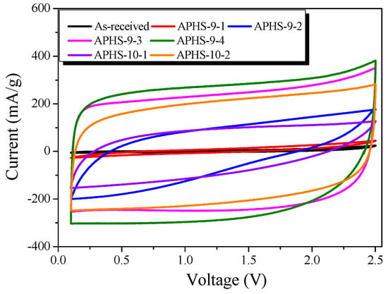 The typical cyclic voltammograms (CV) of the capacitor cells are shown in Figure 8. All the CV curves are rectangular without obvious redox current on both positive and negative sweeps over the whole potential range of 0.1 to 2.5 V at 30 mV/s in the organic electrolyte (1M TEABF4/PC). At longer activation time, CV curves gradually change into rectangles. Moreover, APHS-9-3 and APHS-9-4 show a symmetric, quasi-rectangular shape profile typical of ideal EDLCs. This is consistent with the results of pore characteristic analysis and seems to be because the pores are better developed than those of other ACs. Generally, the specific capacitance of an electrode is in proportion to the integrated area of its CV profile under the same scan rate and voltage window (i.e., the larger the integrated area is, the greater the specific capacitance). As activation time increases, the area of the CVs tends to increase. The capacitance of the electrodes calculated from the CV curves decreases in the following order: APHS-9-4 > APHS-9-3 > APHS-10-2 > APHS-10-1 > APHS-9-2 > APHS-9-1. Among the carbon samples, APHS-9-4 shows the highest specific capacitance due to its uniform mesopores and high specific surface area.