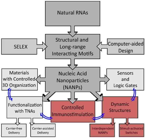 Schematic of the development of nucleic acid-based nanoparticle (NANP) technologies and their current applications. Structural motifs inspired by structure–activity studies of natural RNAs, computer-assisted design, or determined by SELEX (systematic evolution of ligands by exponential enrichment) are used for the rational design of NANPs. NANPs can then be programmed for multiple applications for materials organization, sensors, and dynamic structures, or can be functionalized with therapeutic nucleic acids (TNAs) or used to elicit a controlled immune response.