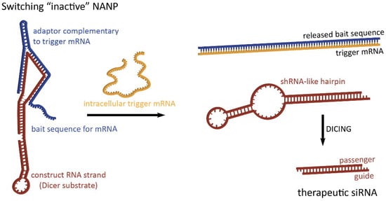 To take full advantage of the programmability of nucleic acids, therapeutic NANPs could be conditionally activated inside human cells for the release of preprogrammed functionalities which would offer higher targeting specificity, thereby potentially reducing off-target effects. The “dynamicity” preprogrammed in NANPs’ behavior defines their ability to be activated in response to various stimuli. By interacting with, for example, a target strand or environmental variable of choice as a diagnostic step, switching NANPs can be designed to release therapeutics only when these interactions occur [56,57]. In the absence of the predetermined intracellular trigger mRNA, characteristic only for the diseased cells, these switching NANPs are not in active therapeutic conformations (Figure 2). The single-stranded bait sequences made of RNA (or chemically modified nucleotides) that deactivate switching NANPs are computationally designed to provide a thermodynamically more favorable binding to the trigger mRNA than to NANP strands [56,57]. The interactions between the switching NANPs and trigger mRNA removes the bait strand and consequently exposes shRNA-like hairpins that become the next most thermodynamically stable fold of the remaining NANP. The human enzyme Dicer can now recognize and cleave these refolded structures and load the RISC with the “guide” strand which, in turn, will activate RNAi. RNAi activation results in the suppression of targeted anti-apoptotic genes, thus inducing the programmed death of the diseased cell.