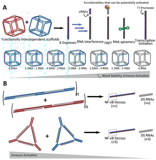 Lastly, hybrid RNA/DNA fibers and polygons can interact with their cognate structures for reassociation, resulting in the release of DS RNAs as well as double-stranded DNAs carrying NF-κB decoys (Figure 3B) [73]. NF-κB (nuclear factor kappa-light-chain-enhancer of activated B cells) is expressed in most animal cells and generally remains in an inactive state in the cytoplasm until it can be activated for translocation to the nucleus, where it is then involved in the production of pro-inflammatory cytokines. With the release of NF-κB decoys [74,75], which can bind and retain NF-κB in the cytoplasm, the hybrid fibers and polygons dynamically modulate the immune response in addition to RNAi activation. Further, this strategy takes advantage of all strands included in the assembly to utilize them in functional roles, leaving no static byproducts [73].