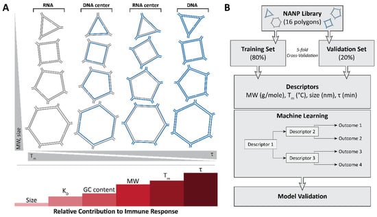 It is becoming apparent that interactions between NANPs and the immune system must be defined to permit the successful translation of this technology to the clinic. Foreign nucleic acids can produce a robust and severe response in immune cells. Pro-inflammatory cytokines and type I interferons are characteristic of nucleic acid sensing in immune cells, and in animals, it can produce anywhere from minor inflammation to severe cytokine storms. Therefore, to address fundamental questions regarding the immune recognition of these novel materials in a timely fashion, the relation of features such as the size, shape, composition, and physicochemical properties of various polygonal NANPs [76] to the activation of immune responses in human microglia-like cells (hµglia or hHµ) was examined [48] using a series of assembled RNA, DNA, and RNA/DNA hybrid NANPs. A set of several polygons designed based on the versatile tetra-U helix linking motif [76] was assembled by using a ubiquitous set of strands (both RNA and DNA) so that their immunostimulatory effects—when composed of all RNA, RNA with a DNA center, all DNA, and DNA with a RNA center—could be characterized (Figure 4A). The engineered NANPs were designed to assume various shapes and sizes as well as variations in their content (RNA vs. DNA) and physicochemical stabilities while having minimal differences in their sequences. The measured biomarkers of a pro-inflammatory response were cytokines and type I interferons. Using modern machine learning techniques, the quantitative structure–activity relationship (QSAR) models were developed to successfully predict and engineer NANPs able to stimulate an intended immune response, or lack thereof [48].