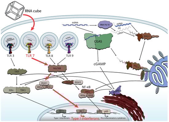 Abridged illustration detailing the pathways involved in the endosomal and cytosolic sensing of smaller therapeutically relevant nucleic acids. NANPs have been observed to enter through the endosomal pathway (when complexed with Lipofectamine 2000) and trigger the toll-like receptors (TLRs). The pathway shown in red (for TLR 7) demonstrates the identified route for RNA cube recognition. For the purpose of this review, the figure shows all individual TLRs (related to NA sensing) in separate endosomes in order to better highlight the particular pathway of NANPs’ recognition.