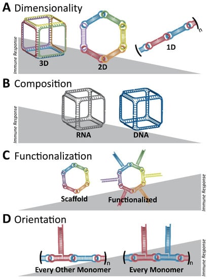 Initial overall immunostimulatory trends observed with variations in NANP designs. (A) Three-dimensional RNA cubes are potent immunostimulants, followed by two-dimensional RNA rings and one-dimensional RNA fibers. (B) Between structures of the same dimensionality, RNA NANPs are more immunostimulatory than DNA NANPs. (C) A NANP scaffold becomes more immunostimulatory if it is functionalized, for example, with TNAs. (D) For RNA fibers which are less immunostimulatory in terms of dimensionality, functionalization at every monomer results in a greater immune response than if the fibers are functionalized at every other monomer. Different colors emphasize the architecture of NANPs consisting of multiple strands (A,C,D) or changes in their composition (B) such as DNA vs. RNA.