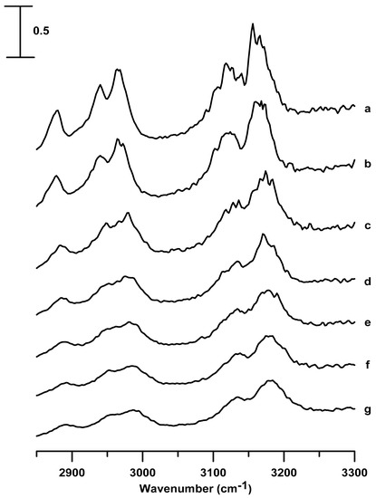 Figure 6 shows the IR absorptions of [C4C1Im][BF4] in a silica matrix obtained under ambient pressure (curve a) and at pressures of 0.4 (curve b), 0.7 (curve c), 1.1 (curve d), 1.5 (curve e), 1.8 (curve f), and 2.5 GPa (curve g). The spectral features of [C4C1Im][BF4] in a silica matrix, shown in Figure 6, are similar to those displayed for pure [C4C1Im][BF4] in Figure 5. In Figure 6, which presents the results of [C4C1Im][BF4] in a silica matrix, the C4,5–H (3164 cm−1), C2–H (3120 cm−1), and alkyl C–H (2967 cm−1) bands are blue-shifted accompanied by band broadening, as the pressure is surged from ambient to 2.5 GPa.
