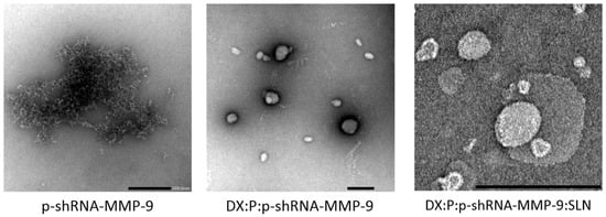 The images of p-shRNA-MMP-9, DX:P:p-shRNA-MMP-9 complex (w/w ratio 2:1:1), and DX:P:p-shRNA-MMP-9:SLN vector (w/w ratio 2:1:1:5), acquired by Transmission Electronic Microscopy (TEM). Scale bar: 200 nm. DX: dextran; P: protamine.