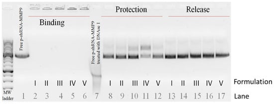 To analyze the ability of the vectors to bind, protect, and release p-shRNA-MMP-9 plasmid, an agarose gel was conducted. The absence of bands in lanes 2–6 in Figure 2 indicates that all vectors were able to completely bind the p-shRNA-MMP-9. The gel also shows that formulations I to III (lanes 8–10, respectively) protected the plasmid more efficiently than formulations IV and V (lanes 11 and 12, respectively). After the treatment of the nanosystems with SDS, the plasmid was effectively released (lanes 13 to 17).