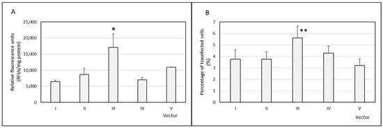 The transfection efficacy of the vectors in human corneal epithelial (HCE)-2 cells. (A) Relative fluorescence units per mg of protein (RFUs/mg protein) of the transfected cells. (B) Percentage of transfected cells (n = 4). Data are expressed as mean ± standard deviation. * p < 0.05 with respect to the other formulations. ** p < 0.05 with respect to formulations I, II, and V.