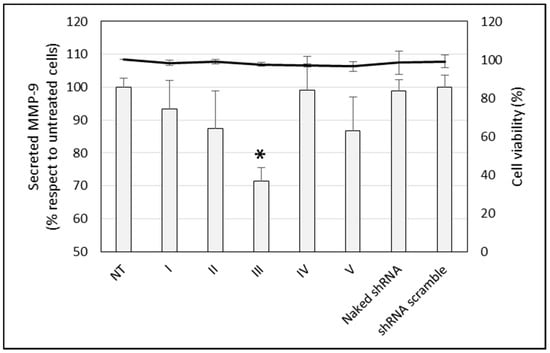 The secreted MMP-9 levels (bars, expressed as a percentage with respect to untreated cells) and viability (line) of HCE-2 cells treated with the vectors and naked p-shRNA-MMP-9. Data are expressed as mean ± SD of 4 experiments. NT: non-treated cells. * p < 0.05 with respect to NT cells.