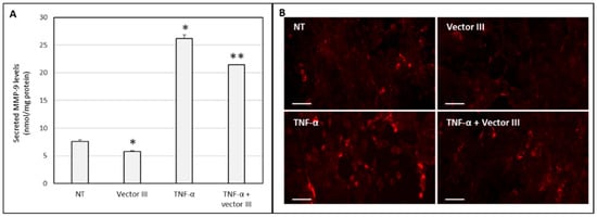(A) The secreted MMP-9 levels in HCE-2 cells untreated and treated with vector III, TNF-α, or both. (B) Fluorescence images of immunostained MMP-9 in HCE-2 cells untreated and treated with vector III, TNF-α, or both. NT: non-treated cells. * p < 0.05 respect to non-treated cells (NT), ** p < 0.05 respect to TNF-α. Scale bar: 60 µm.