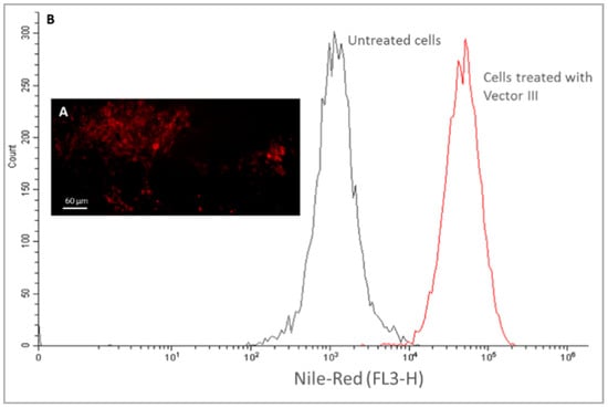 The uptake of the vector III in HCE-2 cells 2 h after transfection with Nile Red-labelled vector containing p-shRNA-MMP-9 against MMP-9. (A) Fluorescence microscopy image (40×); (B) flow cytometry histograms.