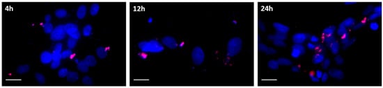 The fluorescence microscopy images of HCE-2 cells at different times after addition of vector III (4, 12, and 24 h). Ethidium monoazide (EMA)-labelled DNA (red) and nuclei stained with DAPI fluoromount-G® (SouthernBiotech, Birmingham, AL, USA) (blue). Scale bar: 20 µm.